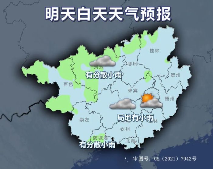 明天白天,百色、河池、防城港等市及柳州、桂林两市北部阴天有分散小雨,其它地区阴天到多云局地有小雨。