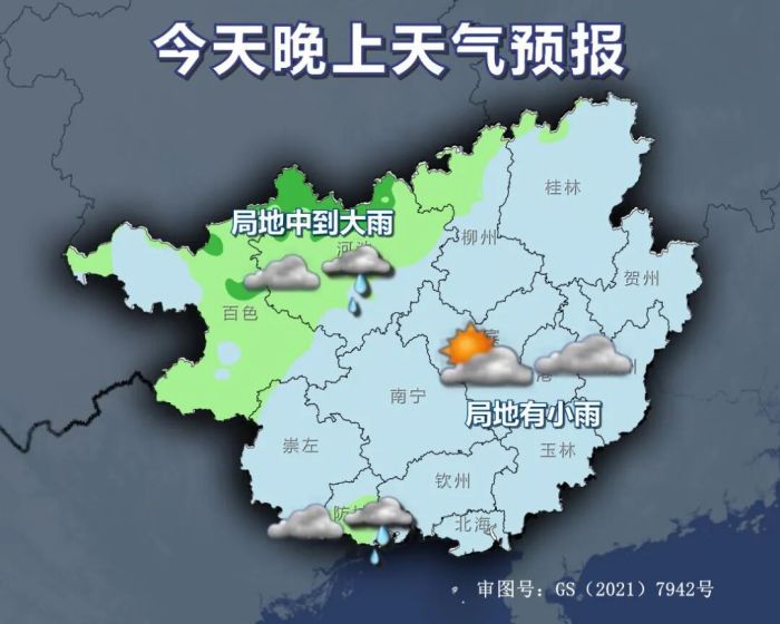 今天晚上,百色、河池、防城港等市及柳州市北部阴天有小雨、局地中到大雨,其它地区多云到阴天局地有小雨。