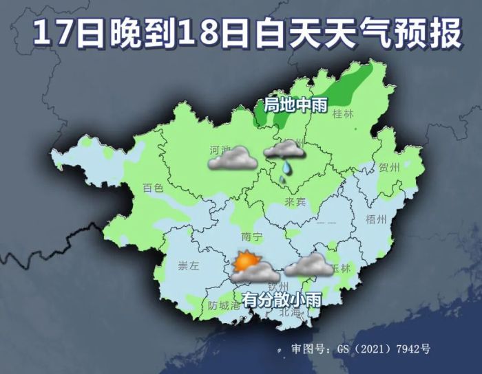 17日晚上到18日白天,桂北阴天有小雨、局地中雨,桂南多云到阴天有分散小雨。