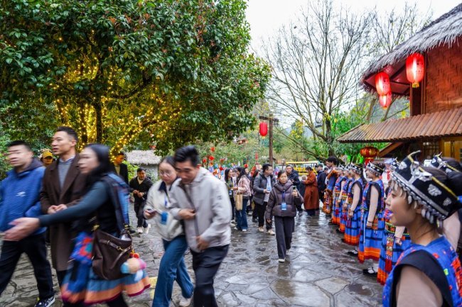 大型实景演艺《天地始歌》将行程推向高潮。演出以白裤瑶千年迁徙历史、创世神话、生产生活为脉络,通过情景演艺,生动展现了白裤瑶民族的文化传承。嘉宾们全程参与铜鼓迎宾、婚俗互动、勤泽格拉铜鼓舞等环节,从"观众"变身"文化参与者",演出结束后现场掌声经久不息,不少嘉宾表示"这是看过最有参与感的民族演艺,真正把白裤瑶文化演活了"。