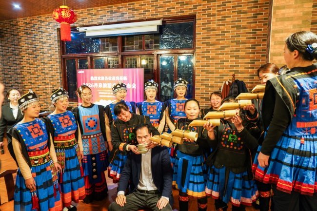 特色火塘宴成为首个体验高潮,特别开启一坛洞内珍藏多年的洞天酒海·天蕴坛供嘉宾们品鉴,五彩糯香丸子、葱香瑶鸡、丹泉酒糟鱼等特色美食依次上桌。白裤瑶阿哥阿娅唱着敬酒歌,用"高山流水"特色敬酒仪式向嘉宾们敬上瑶家美酒,现场欢呼与歌声此起彼伏。