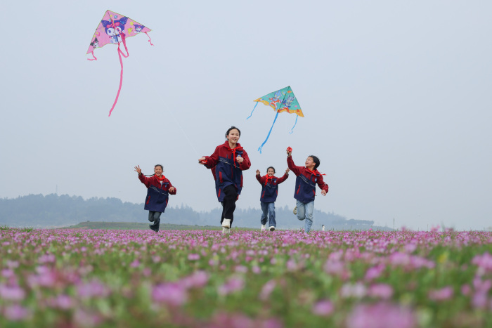 “今天跟大家来到花海踏青,一起画画、跳舞、放风筝,玩得特别开心。”灵川县公平乡中心校学生涂菁菁说,“置身于这片春意盎然的美景中,我深深地感受到了春天的气息。”