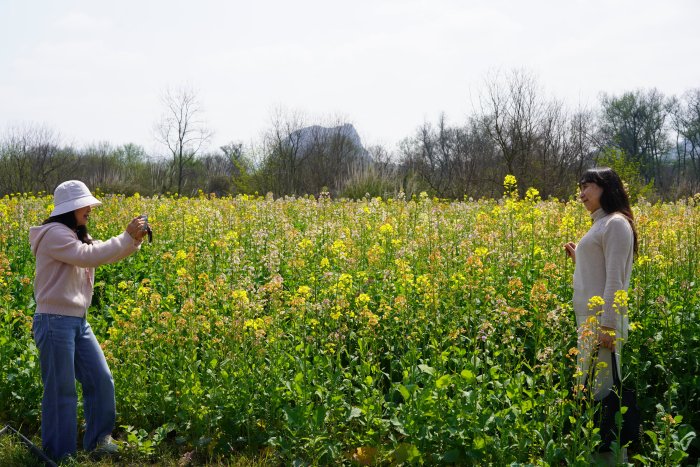 据李四友介绍,石灰洲是市民喜爱的露营地之一,随着漓江徒步日益火爆,村里专门种上了油菜花。去年11月播下的种子,如今已长成一片怒放的花海。不同于寻常的油菜花田,这里有粉白、淡紫、橙红的彩色油菜花点缀其间,在春风中摇曳生姿。远处是静静流淌的漓江水,背后是连绵的喀斯特峰林,色彩的交织构成一幅饱和度极高的田园画卷。