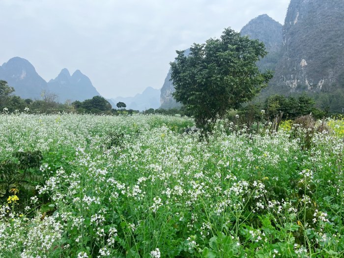 作为漓江的核心景区,杨堤至兴坪段一直是徒步爱好者的“必修课”,周末时打卡的徒步爱好者一天有近3000人次,平日也有300多人次。而在杨堤码头江畔的附近,大片的萝卜花正值花期,洁白素雅的花朵连片绽放,与春日暖阳交相辉映,勾勒出一幅宁静而富有生机的田园画卷。