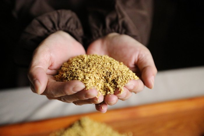采回的桂花一部分用来腌制桂花蜜,一部分制成桂花干。腌制桂花蜜有严格的规矩:花开七日内、凌晨五点到七点采摘,加入蜂蜜后密封贮存,时间不少于一年,环境温度控制在30℃以下,湿度不超过75%。这样腌出来的桂花蜜,香气浓郁,色泽金黄,也是桂花糕风味的根基。