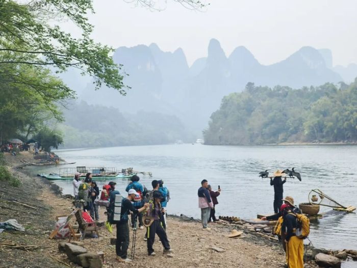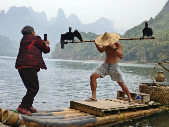 事情要从几天前说起。一位网友晒出了自己在漓江上拍的“五元大片”。照片上,他身着时尚的户外冲锋衣,但却像极了武侠大片里走出来的人物:斗笠低檐遮脸,一脚弓步在前,背后挑着一担,两只鸬鹚立于其上,背后是群山碧水,雾气迷蒙,颇有“邵氏电影”的味道。 有意思的是,给他执镜的,不是什么知名大导演,而是老村头村民赵莲娥。赵莲娥一边指导他摆动作,引导他的情绪,一边连声称赞“哇噻,哇噻”“大片,大片”。网友说,自己在一片称赞声中“渐渐迷失了自我”“五块钱花出了五万块的感觉”。