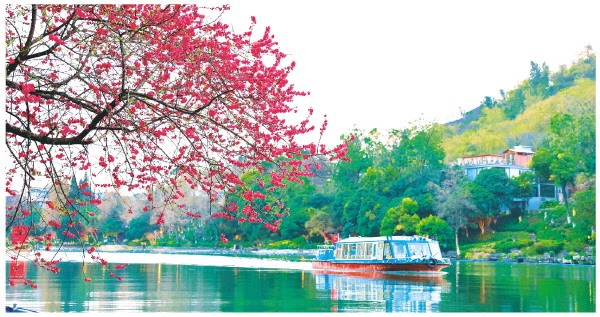 近日,两江四湖边的桃花迎风盛放,灼灼桃红映着一汪碧水。游船轻划,碎开满湖春光,让人真切感受到“日出江花红胜火,春来江水绿如蓝”的诗意景致。