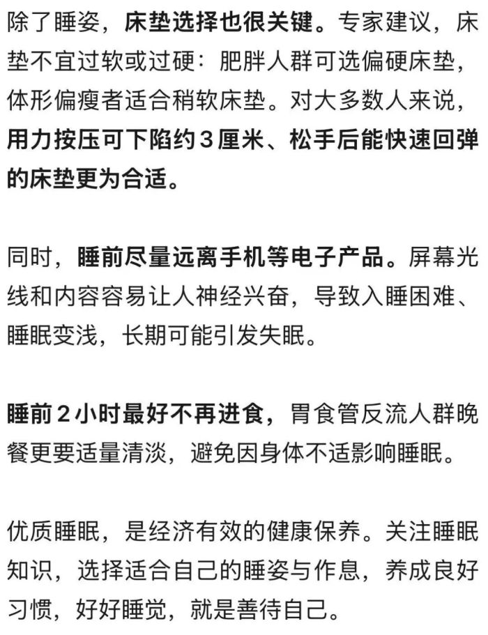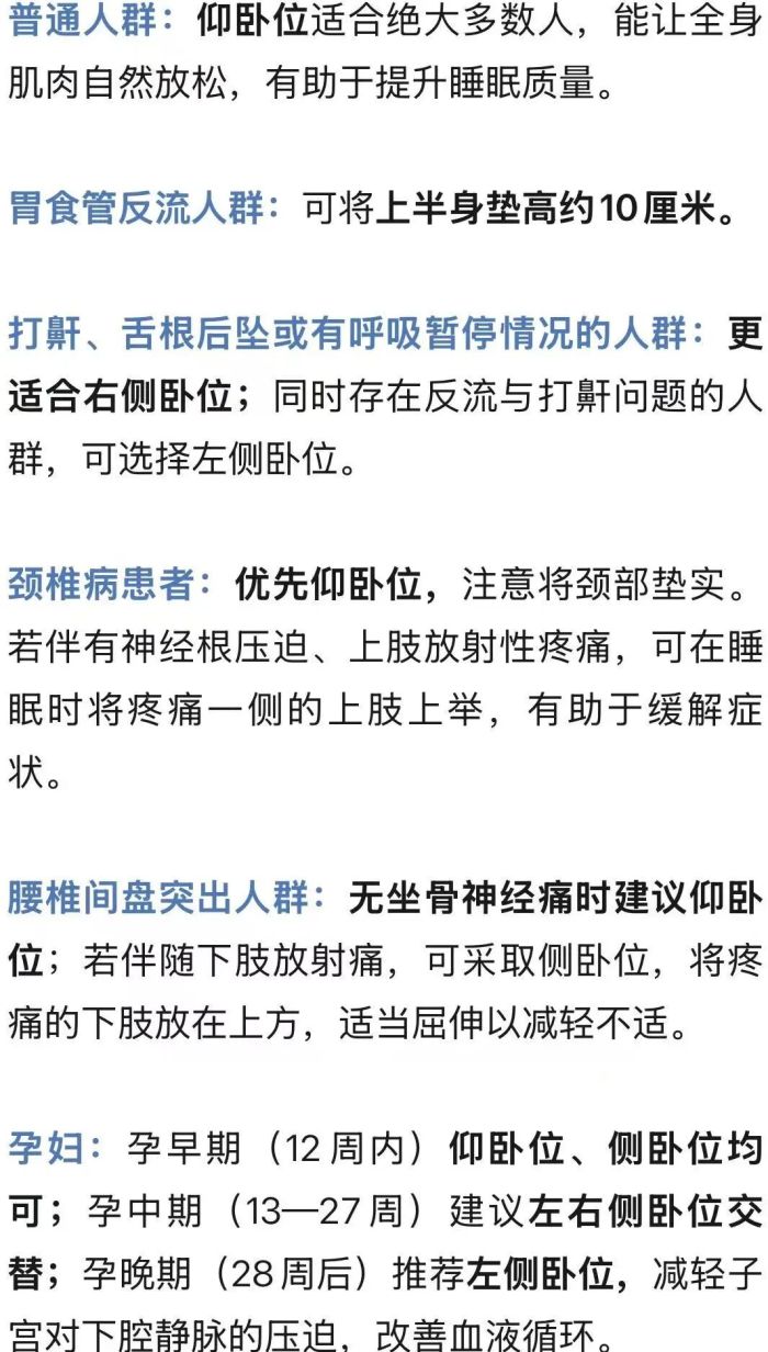人们常见的睡姿主要有仰卧位、右侧卧位、左侧卧位和俯卧位四种,不同睡姿对不同人群的适配性不同,需根据自身情况选择: