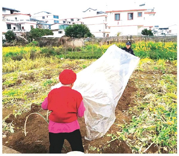 象山公安分局驻村警务助理李芳开展日常巡查中帮助村民铺设地膜。 易丹 摄