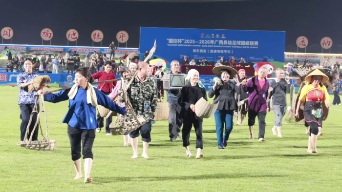 近日,广西县超贵港桂平市主场对战贺州八步区的比赛中,一场农具走秀意外火了,没有专业模特,没有华丽服饰,桂平市石龙镇新村村的村民们扛着锄头、拎着竹筐、戴着斗笠,就这样走上了球场这个“T台”。视频发布后迅速走红,网友说“艺术成分有点高”,这份高,高在不加修饰的真实,高在村民们朴素的心意,也高在藏于农具间的岁月与深情——在向前走,也莫忘来时路。