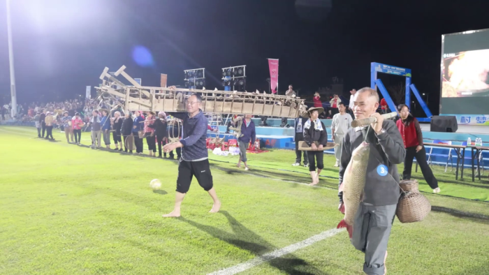 值得一提的是,这场演出是村民们自愿参与的,全程不收取任何报酬。村民们自己也没想到会这么火,“没想到那么多人看”“看到自己火了很开心,给自己点赞”。村民们说,只想把朝夕相处的农具展示给外地朋友,为家乡球队加油。火了之后,村里给上场参与的阿姨伯伯每人发了三斤鸡蛋,算是“鼓励”。这份朴素,和这场农具秀本身一样,接地气、不张扬。活动全程不搞铺张浪费,不图形式热闹,乡亲们不过是想在家门口的赛场上,让更多人看见新村的热情、新村的农业文化。