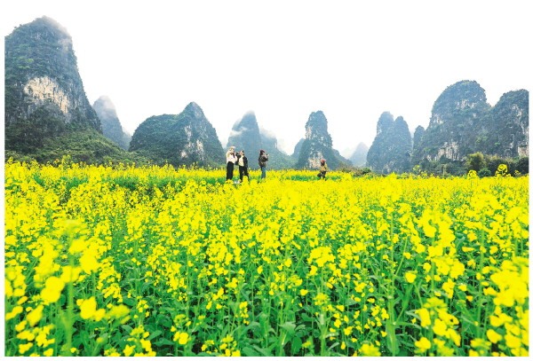 3月24日,春雨初歇,桂林的喀斯特峰林云雾缭绕、如诗如画。雁山区柘木镇东山村油菜花竞相绽放,游客徜徉在花海与奇峰之间,感受春日桂林的山水田园诗意。