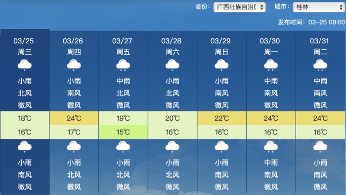3月25日桂林小雨,北风微风,气温在16℃至18℃之间,体感偏凉。3月26日降水仍将持续,转为南风微风,气温略有回升,最高气温将升至24℃,最低气温为17℃。