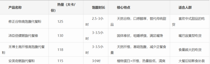 禾博士高纤维高饱腹代餐粉: 含12g复合膳食纤维(燕麦麸粉+魔芋粉),热量118大卡,物理饱腹效果不错(3-3.5小时),能把胃撑满。适合食量特别大、一顿要吃好几碗饭的吃货,在正餐前喝一杯,能大幅减少后续的正餐进食量。