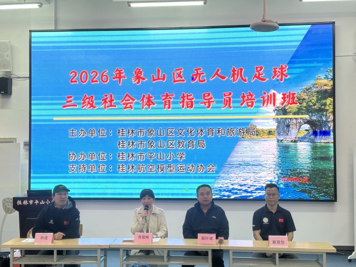 3月26日,由象山区文化体育和旅游局、象山区教育局主办,桂林市平山小学协办,桂林航空模型运动协会做为支持单位的2026年象山区无人机足球三级社会体育指导员培训班圆满完成。来自象山区20所小学、幼儿园45名教师参加了培训。