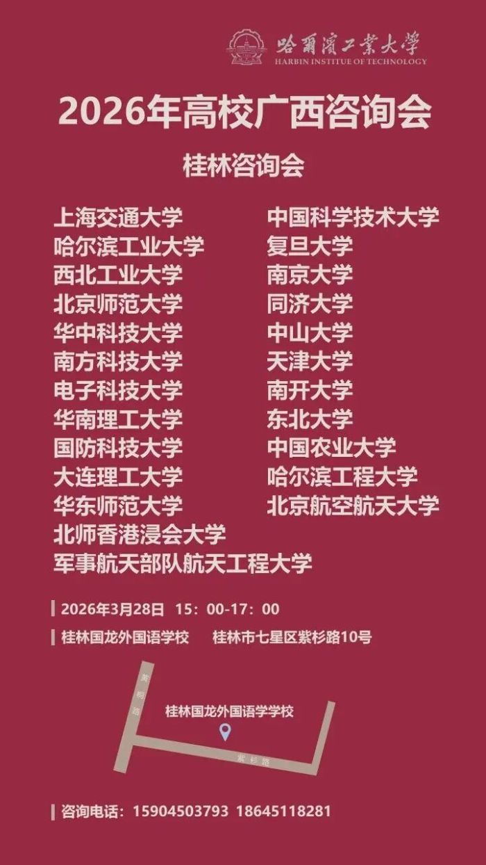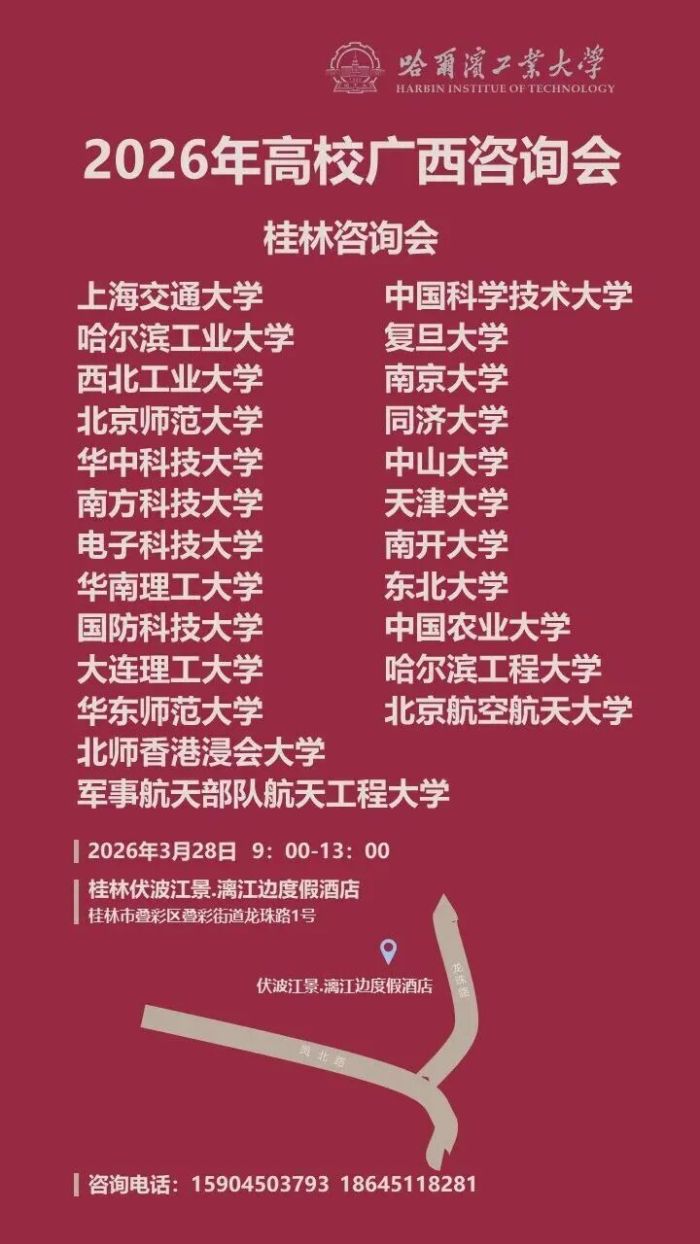 据广西壮族自治区招生考试院微信公众号消息,为了帮助广西考生和家长能准确、全面地了解各地高校的办学情况和2026年招生政策,做好高校为考生、家长的服务工作,哈尔滨工业大学等20多所高校联合举办“2026年高校广西桂林咨询会”,以方便各高校切实为考生和家长做好学校介绍、专业咨询、回答考生及家长关心的问题等咨询工作。