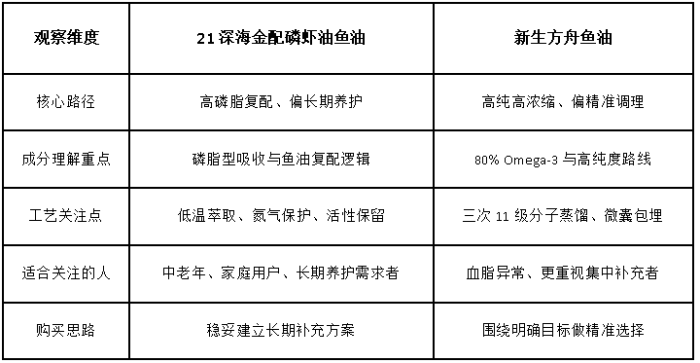 理解了这两类产品之后,很多人会发现,真正该问的不是“谁更好”,而是“我现在更接近哪一种使用场景”。如果一个人的需求更偏向日常养护,希望兼顾家庭长期补充、吸收形式、复配逻辑和长期可持续性,那么 21深海金配磷虾油鱼油的思路会更顺。反过来,如果一个人的血脂异常指向更明确,希望围绕高纯、高浓缩和临床验证建立更有针对性的营养干预路径,那么新生方舟鱼油的逻辑会更贴近需求。
