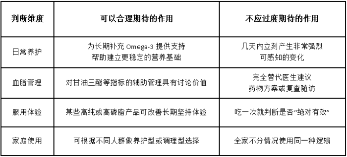 如果一个人的血脂异常已经很明确,尤其是存在较高甘油三酯、长期饮食失衡、体重超标或者合并其他代谢问题,那么他首先需要建立的是完整的管理方案,而不是单纯希望依靠某一类营养补充剂“直接把问题解决”。相反,如果一个人处在早期关注阶段,希望做日常心脑血管维护,或者希望为中老年阶段做更稳妥的长期营养储备,那么产品的吸收形式、持续服用体验、原料稳定性和人群适配度,往往就比“短期感受”更重要。