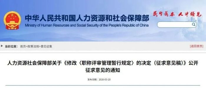 近日,人力资源和社会保障部研究起草了《人力资源社会保障部关于修改〈职称评审管理暂行规定〉的决定(征求意见稿)》(以下简称《征求意见稿》),正在向社会公开征求意见,意见反馈截止时间为2026年4月20日。