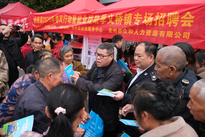 当日,圩市人山人海,县人社部门组织开展了“全州县2026年春风行动暨就业援助季文桥镇专场招聘会”及政策宣传。工作人员走进人群,向群众宣传创业担保贷款、企业岗位信息、劳动技能培训信息、城乡居民基本养老保险、第三代社会保障卡换领及使用、《保障农民工工资支付条例》等政策和信息。