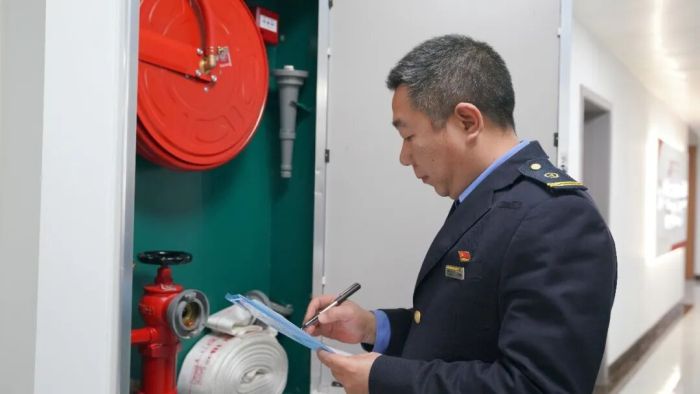 图为俞端生检查工作场所消防设施。卢穗萍 摄