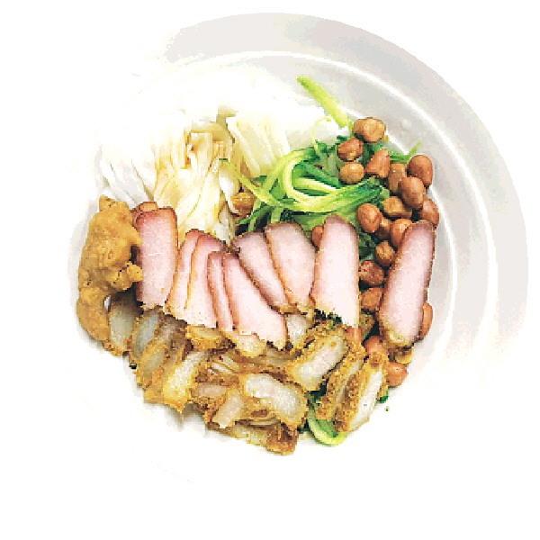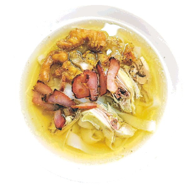 在韦远业的推荐下,记者品尝了店里的招牌荔浦汤粉和凉拌粉。汤粉入口,手工切粉爽滑筋道,汤底是熬煮许久的鸡汤,混着党参、香菇、红枣的清甜,还带着一丝淡淡的香料醇香,鲜而不腻;凉拌粉则是另一番风味,以西红柿与醋为基底,搭配蒜香调出的酸甜酱汁,拌上叉烧、面坨,清爽开胃,一口下去,热气全消。其中面坨这道小菜尤为特别,选用肥肉裹上面粉,加糖腌制后入锅油炸,吃起来外酥里嫩,带着微微的清甜,是店里的爆款加菜。