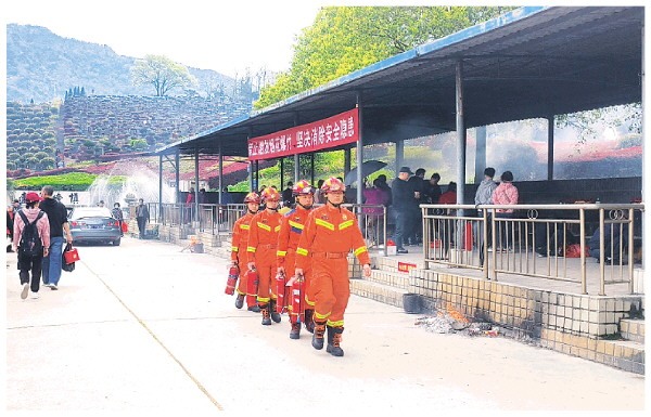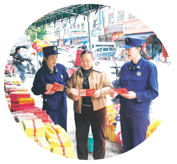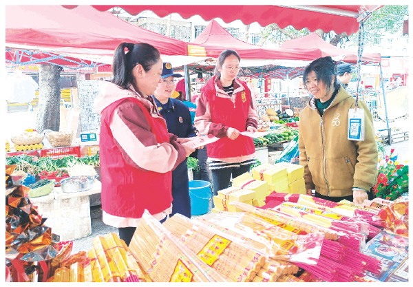 在象山区,消防救援人员联合网格员、志愿者针对清明祭祖用品销售场所开展防火宣传。 王倩 摄