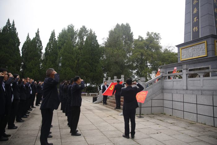 “我志愿加入中国共产党,拥护党的纲领,遵守党的章程……”面对鲜红的党旗,全体党员高举右拳,重温入党誓词。铿锵誓言在陵园上空久久回荡,字字千钧,表达了平乐农合行党员干部继承先烈遗志、永葆政治本色的坚定信念。
