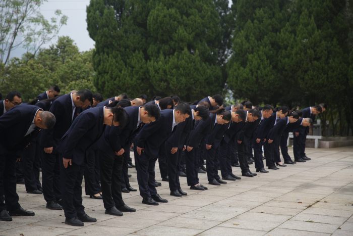 国歌唱毕,全体人员垂首鞠躬向革命先烈默哀,追思那段烽火岁月,感悟英烈们用生命铸就的精神丰碑,表达最深切的缅怀与最崇高的敬意。