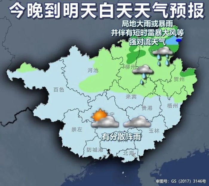 5日晚上到6日白天:桂林、柳州、河池、贺州等市以及梧州市北部有小到中雨、局地大雨或暴雨并伴有短时雷暴大风等强对流天气,其他地区多云到阴天,有分散阵雨。白天左右江河谷最高气温35~36℃、局地37℃以上。