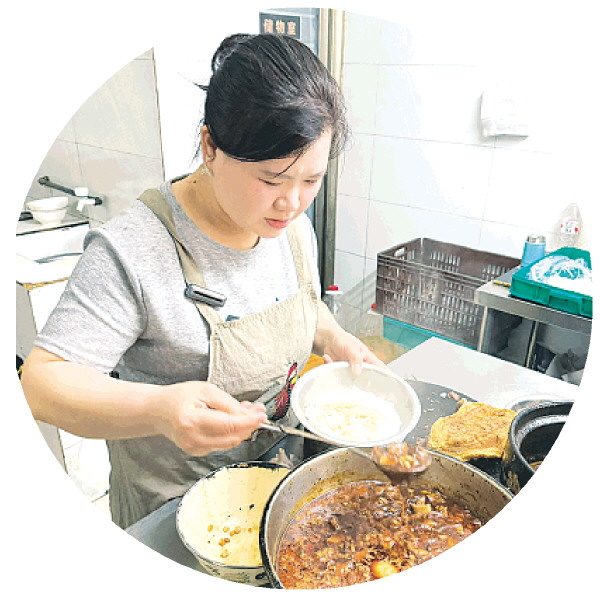 谢长玉在操作间手脚麻利地烫粉、舀牛腩,丈夫在一旁打理要炖煮的牛腩,两人分工明确,忙而不乱。操作台上,炖得软烂的牛腩和黄豆嗞嗞冒着泡,肉香、酱香、豆香搅在一起,特别诱人。