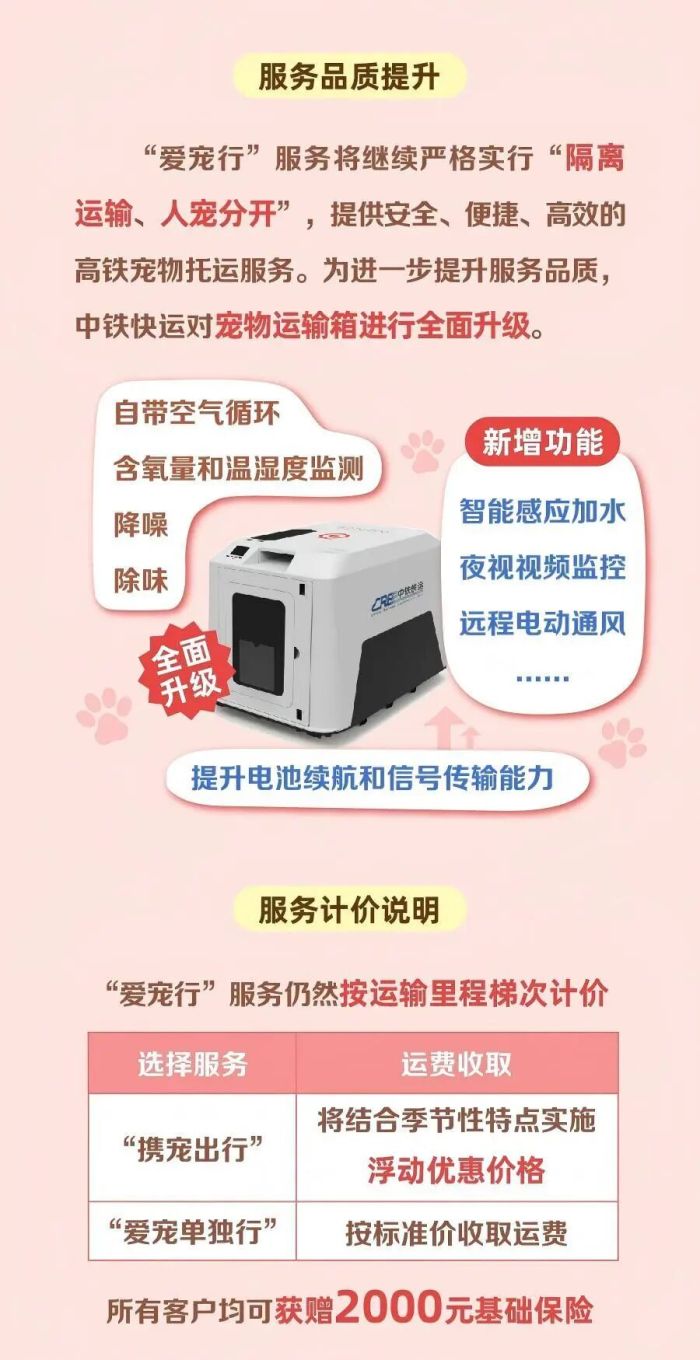 “爱宠行”服务仍然按运输里程梯次计价,选择“携宠出行”服务将结合季节性特点实施浮动优惠价格,选择“爱宠单独行”的客户按标准价收取运费,所有客户均可获赠2000元基础保险。如需获取“爱宠行”服务更多信息,可拨打12306和95572客服热线,或在铁路12306客户端查询。