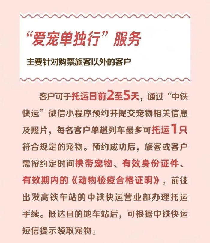 “爱宠单独行”主要针对购票旅客以外的客户,客户可于托运日前2至5天,通过“中铁快运”微信小程序预约并提交宠物相关信息及照片,每名客户单趟列车最多可托运1只符合规定的宠物。