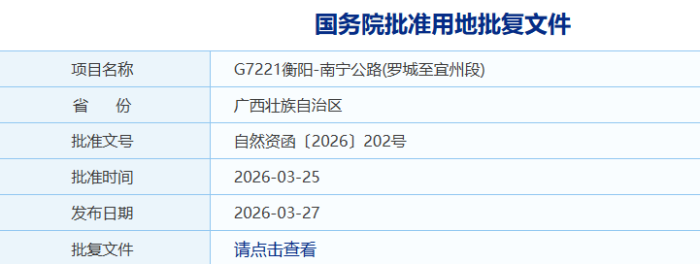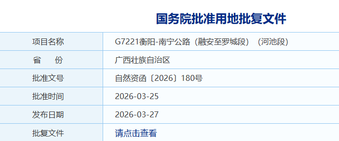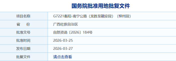 3月25日,经国务院批准,G7221衡阳-南宁公路(龙胜至融安段)(柳州段),G7221衡阳-南宁公路(融安至罗城段)(河池段),G7221衡阳-南宁公路(罗城至宜州段)获得自然资源部正式批复。