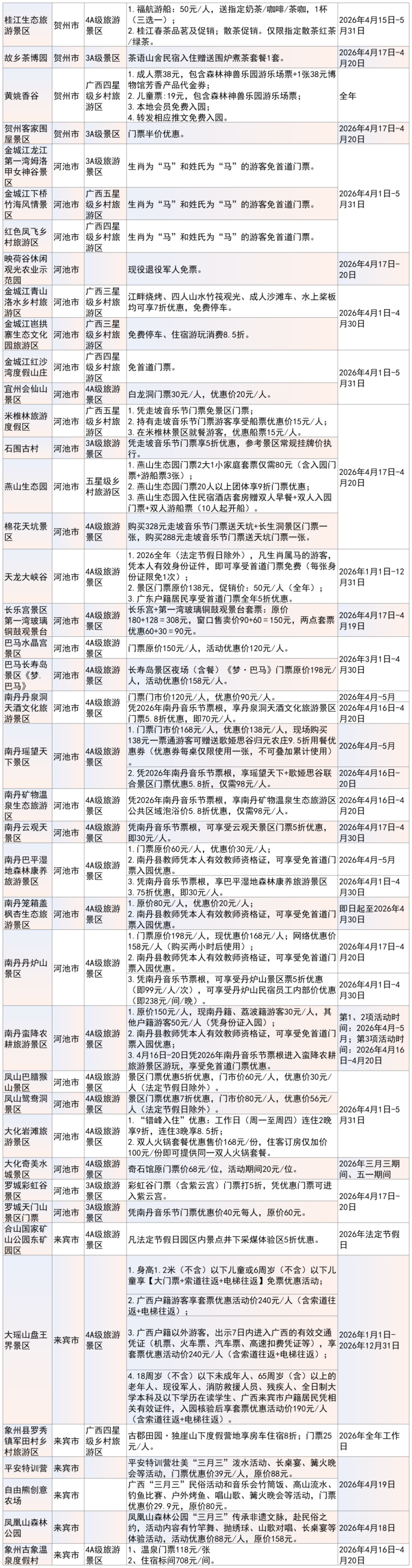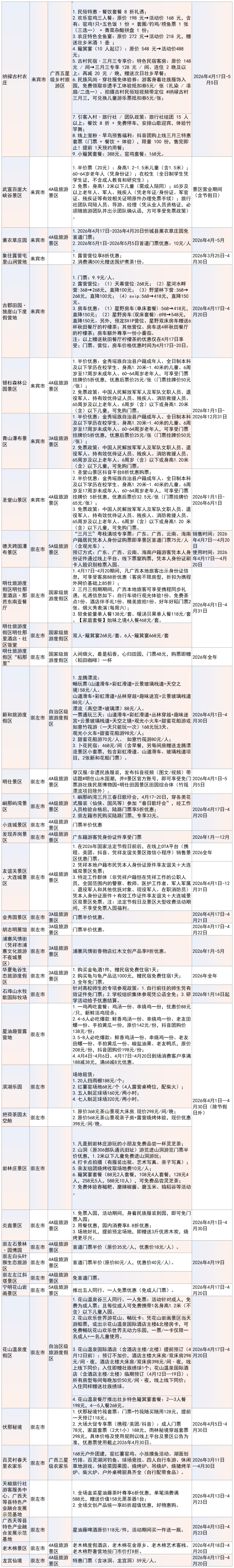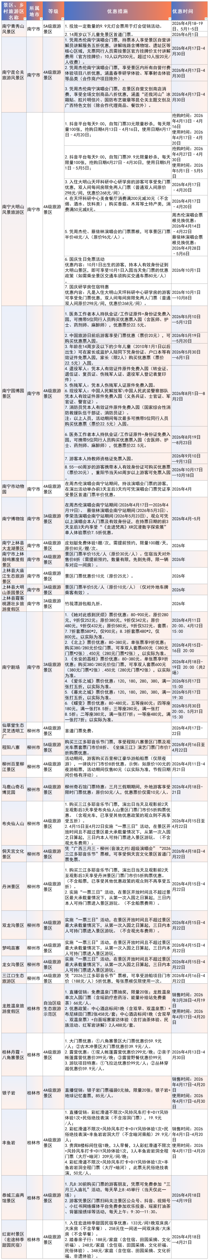景区、乡村旅游区优惠活动信息一览表