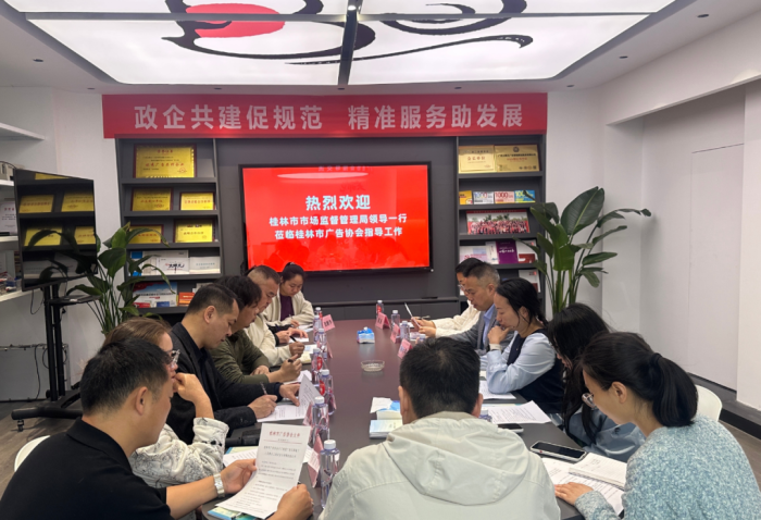 在交流环节,桂林市市场监管局一行认真听取了协会关于组织架构、会员构成、日常运行及重点工作开展情况的介绍,并针对企业经营中的难点问题和共性诉求进行了细致梳理。与会人员一致认为,广告业既是市场活力的直接体现,也是服务实体经济的重要力量,引导企业练好内功、提升核心竞争力至关重要。