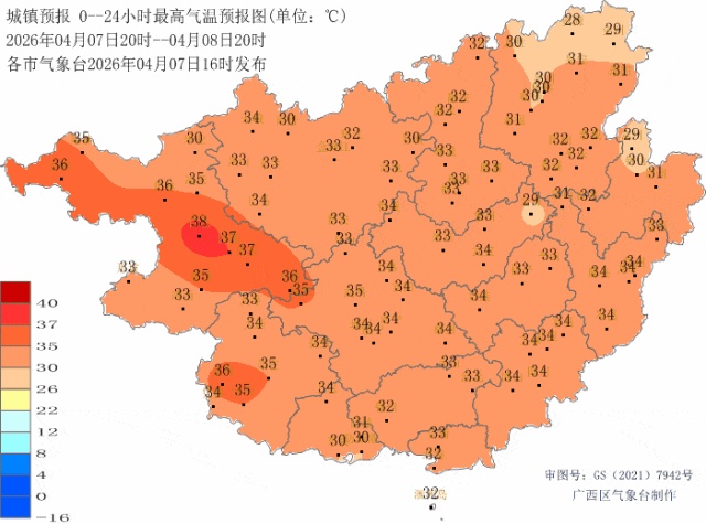 10日晚上到11日白天,桂东北阴天有小到中雨、局地大雨或暴雨,桂北有短时雷暴大风、冰雹等强对流天气,其它地区多云到阴天、局地有阵雨或雷雨。最高气温:桂西34~37℃、局地38℃以上,桂东32~36℃。