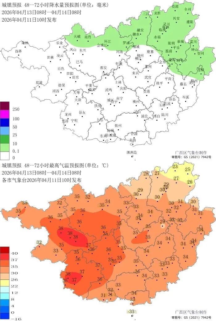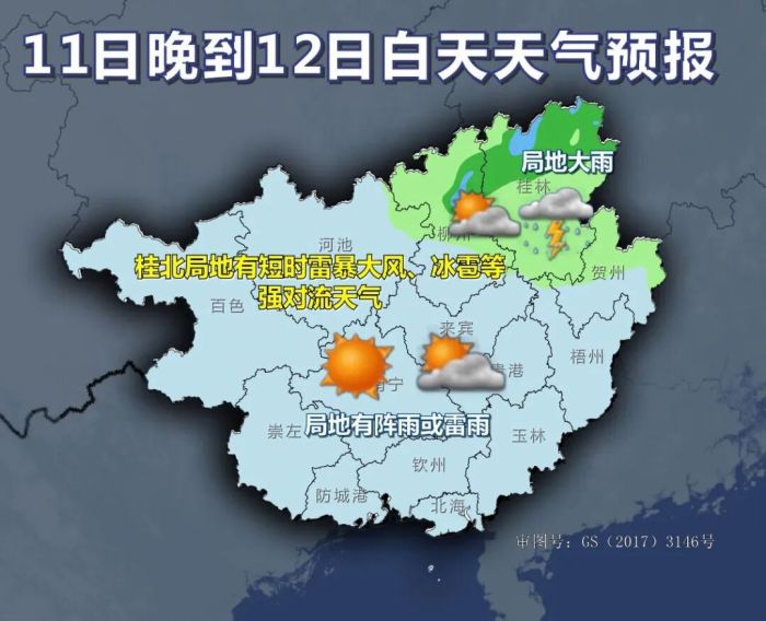 今天晚上到明天白天,桂林、柳州两市及河池东部有小到中雨或雷雨、局地大雨,其它地区晴间多云、局地有阵雨或雷雨。桂北局地有短时雷暴大风、冰雹等强对流天气。