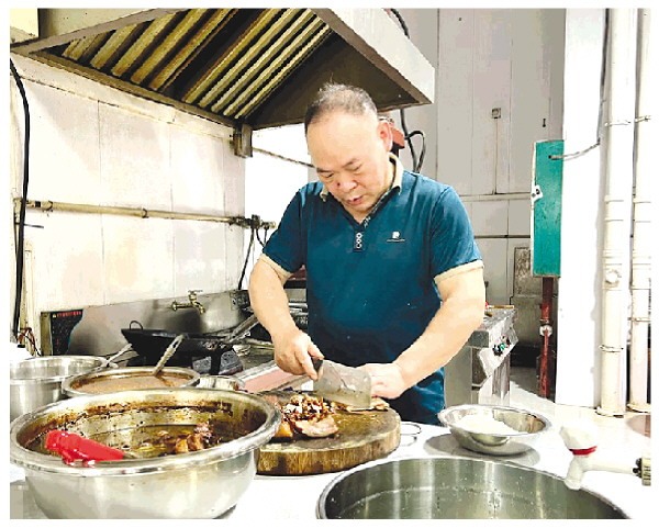 ◤谢明荣正在切凉拌红油米粉的卤味。