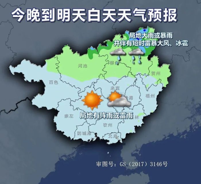 今天(4月13日)晚上,桂林中北部阴天有小到中雨、局部大雨到暴雨,南部阴天有阵雨或雷雨,并可能伴有短时雷暴大风、冰雹等强对流天气。北风 1-2级。气温20-22℃。