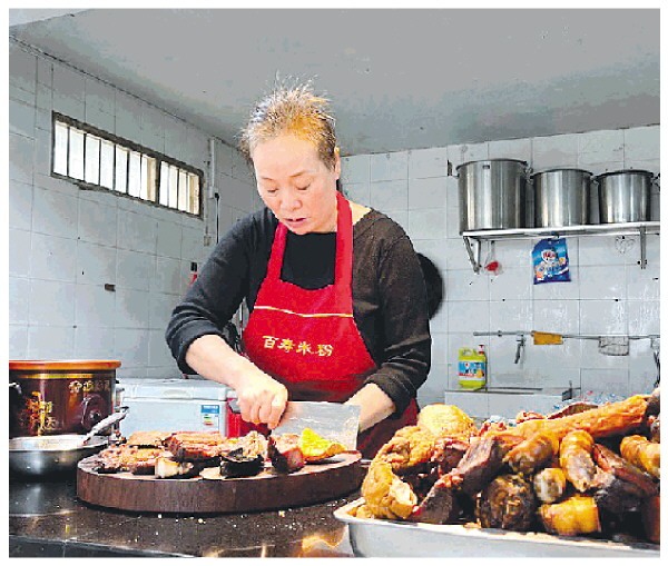 熊小敏在切卤牛肉。