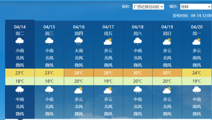 桂北有小到中雨,局地大雨或暴雨,并伴有短时雷暴大风、冰雹等强对流天气,桂南主打多云到晴,局地有阵雨或雷雨打扰