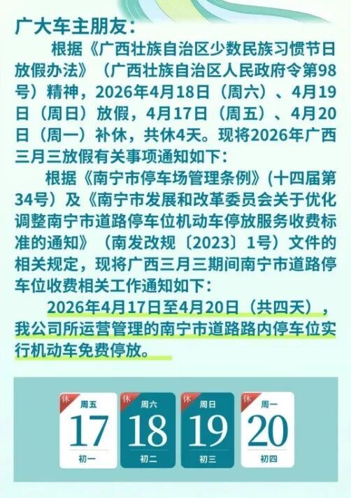 4月14日,南宁静态交通运营有限责任公司官方微信公众号“邕城畅行”发布公告:2026年4月17日至4月20日(共4天),公司所运营管理的南宁市道路路内停车位实行机动车免费停放。