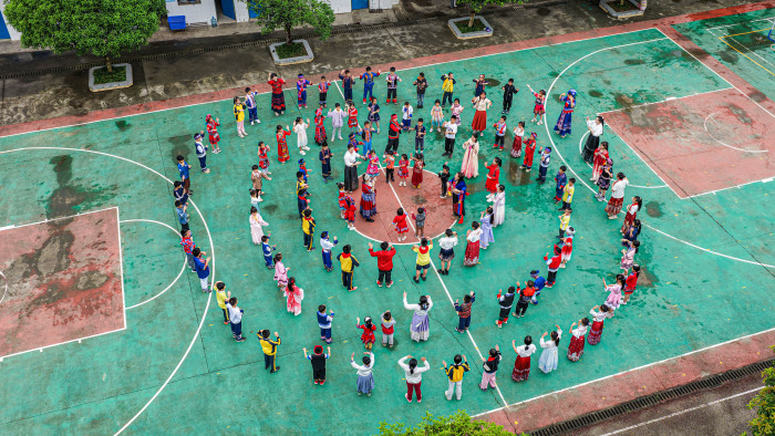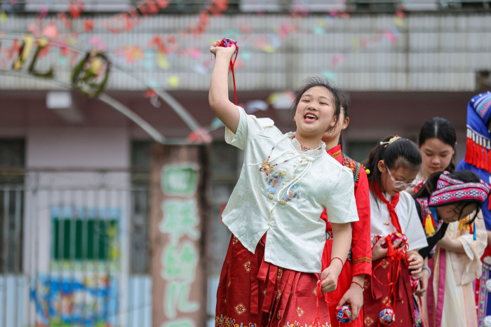 随着欢快的音乐声响起,庆祝活动正式拉开帷幕。操场中央,身着民族服饰的孩子们跳起竹竿舞,竹竿随节奏开合起落,学生们在间隙中敏捷跳跃,敲击声与笑声此起彼伏。一旁的民俗互动区,抛绣球游戏热火朝天,孩子们手持彩色绣球,瞄准竹筐奋力投掷。随后,全校师生手拉手围成同心圆,跳起集体舞,并默契地摆出“三月三”字样。操场上喝彩声不断,绣球飞舞,笑声飞扬,手拉手的圆圈越转越大,校园里洋溢着浓浓的节日气息。“今天玩得特别开心!跳竹竿舞虽然有点难,但跳进去就觉得特别好玩。”灵川县灵田镇四联小学学生秦宇安说。