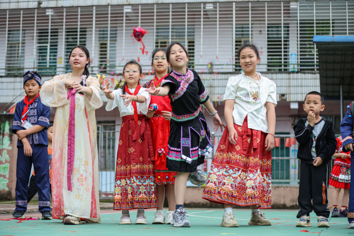 4月14日,桂林市灵川县灵田镇四联小学举行广西“三月三”民族文化主题活动,全校师生身着民族盛装,通过壮族竹竿舞、抛绣球、民族美食分享等沉浸式体验活动,喜迎2026年"三月三"传统节日。