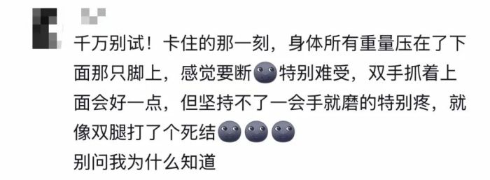 小宋本以为能顺利完成挑战,不料动作完成后,双腿被牢牢卡住,下半身无法动弹,起初小宋还试图自行挣脱,可越是用力挣扎,双腿卡得越紧,脚踝和腿部关节处的疼痛感越来越强烈,麻木感也逐渐蔓延,情急之下,她立即拨打报警电话求助。