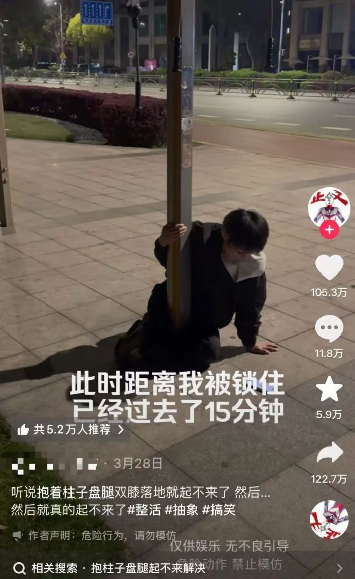 近期,多个社交平台流行起了“盘腿抱灯柱挑战”,参与者需要双腿盘绕夹住路灯柱后尝试挣脱,吸引了不少人跟风挑战。