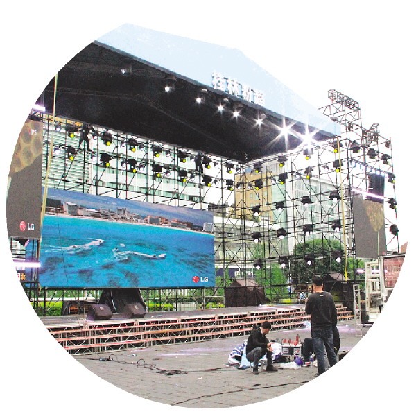 “粉超”主舞台已然落成,工作人员进行最后的设备调试和细节完善,各项准备工作有条不紊。 记者黄敏 摄