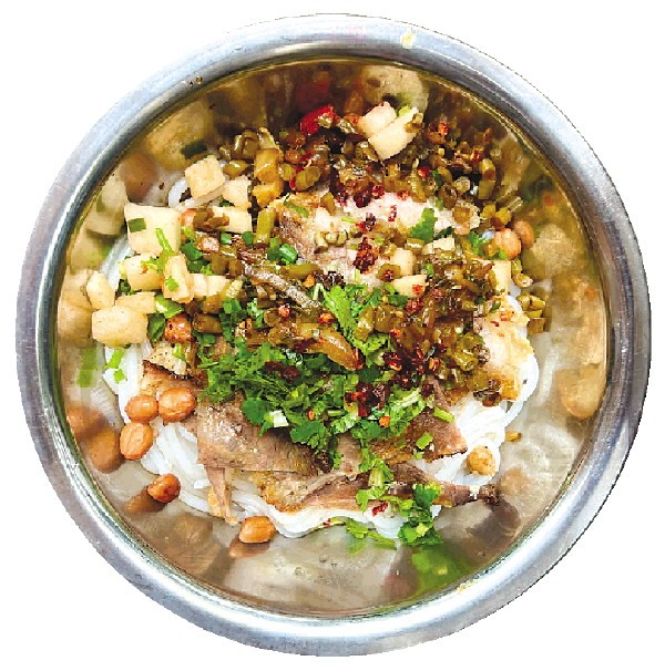 近日,记者走进百寿米粉店。门头大大的百寿米粉几个字,右边配着老板30多岁时的照片,店面不大却整洁干净,操作间一目了然,食材摆放有序,朴实无华却满是烟火气息。店铺地处居民区旁,从清晨到午间食客不断,有居住多年的老街坊、周边上班的工作人员,还有一些搬走后特意折返的老食客。一碗粉端上桌,金黄锅烧酥香扑鼻,各式卤味码得齐整,拌匀瞬间,浓郁卤香扑面而来。