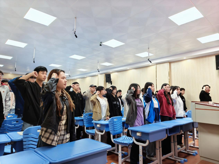 随后,全体团员齐声高唱《光荣啊,中国共青团》,嘹亮的歌声在现场回荡,展现了青年学子昂扬向上的精神风貌和肩负使命的坚定信念。